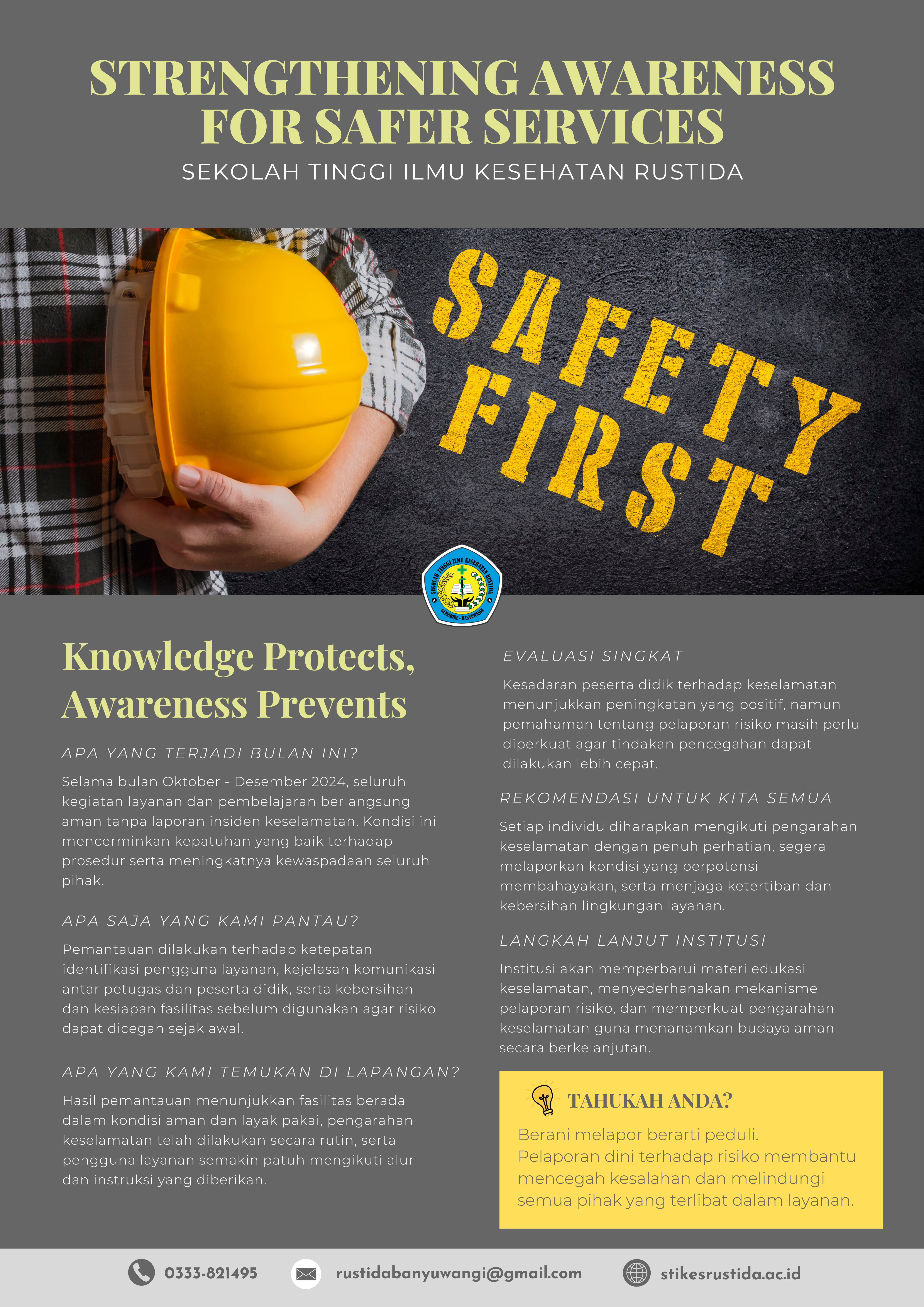 Sebagai tindak lanjut, institusi akan menambah sesi orientasi keselamatan, memperbarui materi edukasi, dan menguatkan mekanisme pelaporan agar semakin mudah diakses. Dengan langkah ini, diharapkan kesadaran dan kepercayaan terhadap budaya keselamatan semakin meningkat.